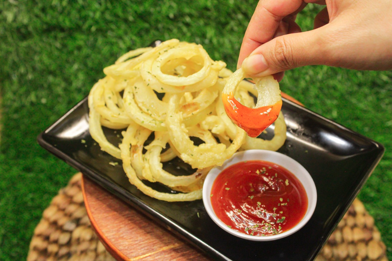 - Goreng onion hingga matang. Angkat dan tiriskan kemudian plating onion tersebut tambahkan 1 sdm SAUS SAMBAL "RED HOT" MAZZONI sebagai cocolan.